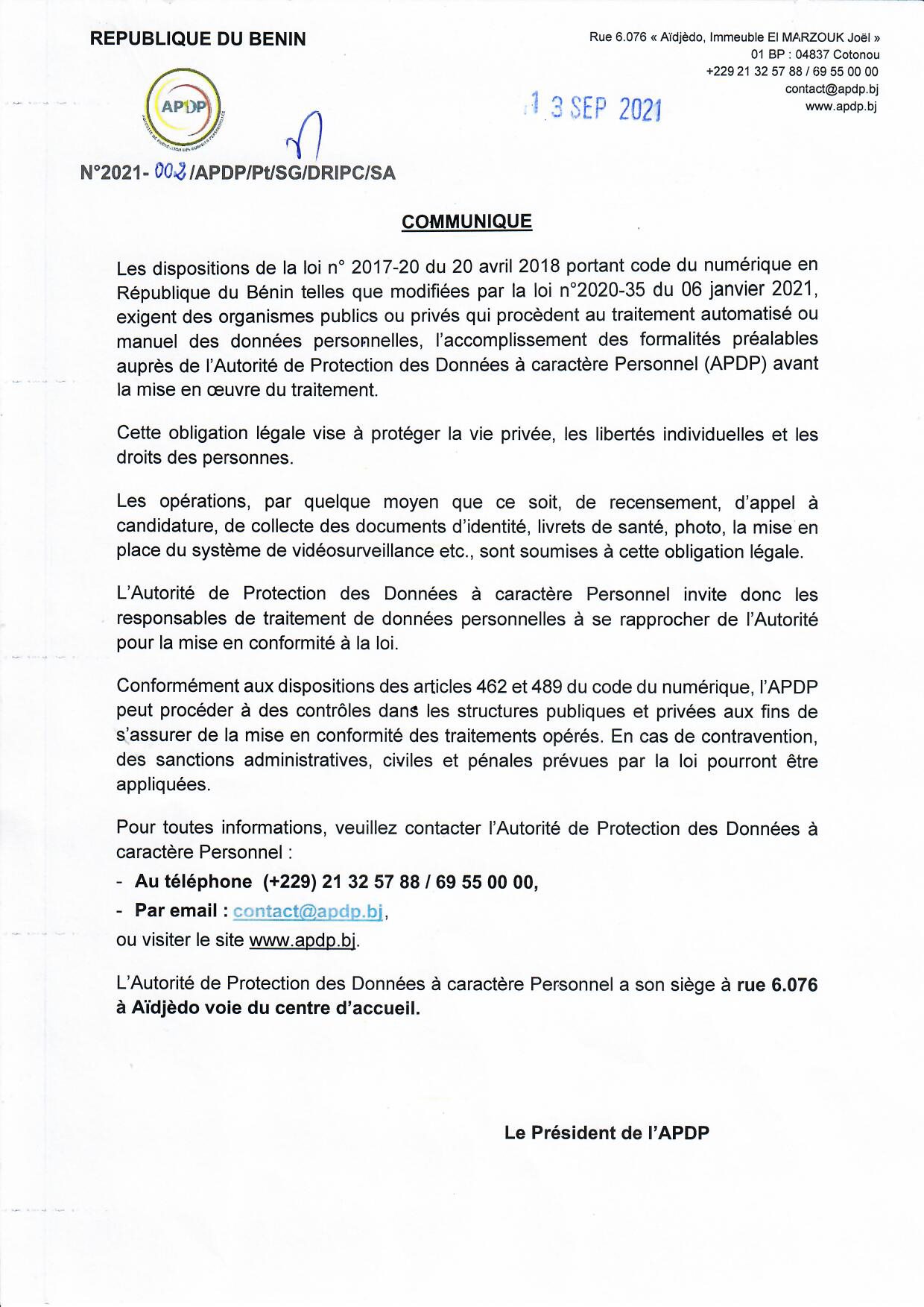 COMMUNIQUE RELATIF A L’ACCOMPLISSEMENT OBLIGATOIRE DES FORMALITÉS PRÉALABLES AUPRÈS DE L’APDP