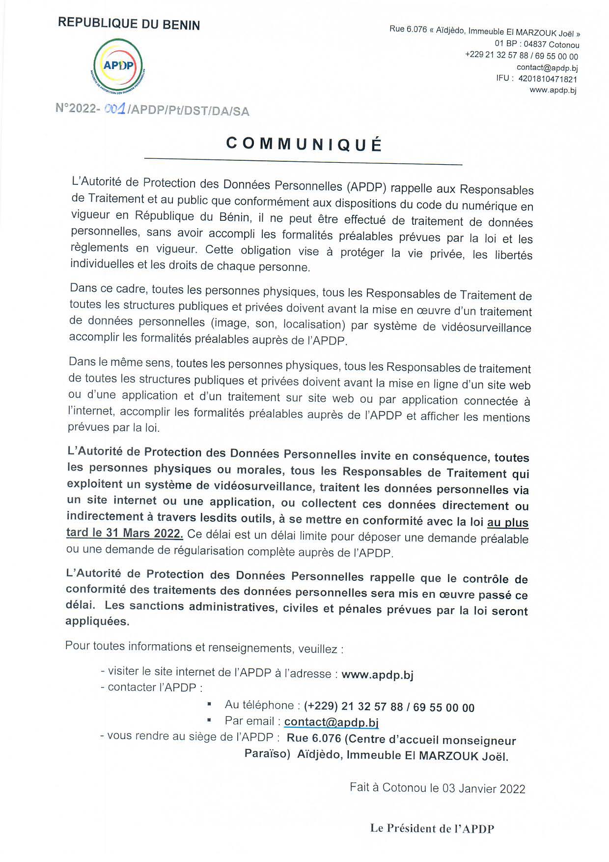 COMMUNIQUÉ RELATIF AU DÉLAI DE MISE EN CONFORMITÉ DES TRAITEMENTS DE DONNÉES PERSONNELLES