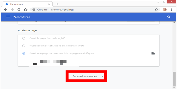 Si vous utilisez Google Chrome, déployez le menu général du navigateur, et rendez-vous dans les Paramètres, puis, en bas de page, dans les Paramètres avancés.