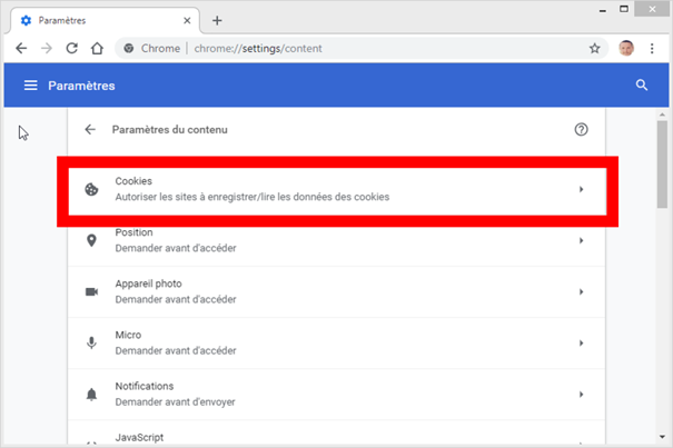 Entrez ensuite dans le menu Paramètres du contenu, puis dans le sous-menu Cookies.
