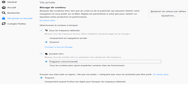 Sur Firefox, ouvrez le menu principal, accédez aux Options du navigateur et entrez dans la section Vie privée et sécurité. En principe, dans la partie dédiée au Blocage de contenu, Firefox est paramétré nativement pour toujours bloquer tous les traqueurs détectés uniquement. Pour les cookies tiers, vous devrez choisir manuellement de bloquer les Traqueurs et de toujours envoyer le signal Ne pas me pister aux sites web.