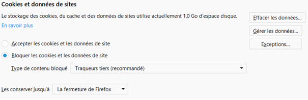 Ensuite, dans la section dédiée aux Cookies et données de sites, les cookies de type Traqueurs tiers devraient être nativement bloqués. Pour le reste des cookies stockés sur votre ordinateur, vous pouvez limiter leur impact en ne choisissant de les conserver que jusqu’à La fermeture de Firefox. Ils seront ainsi supprimés à chaque fois que vous fermez votre navigateur.